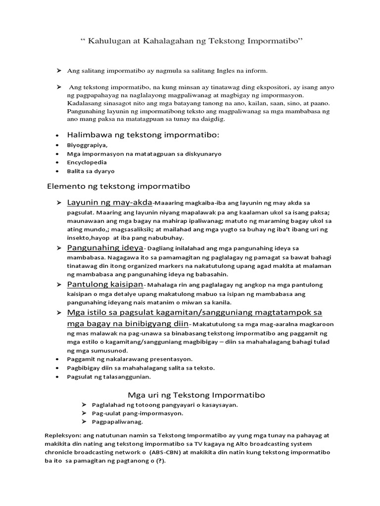 Kahulugan At Kahalagahan Ng Tekstong Impormatibo
